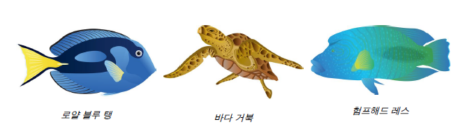모든 바다에는 아주 작은 햄릿, 바슬렛, 고비, 블레니, 자리돔 등의 수 많은 산호초 서식 어류가 있다. 프로그 피쉬, 복어, 거북복어, 뱃피쉬에 해마 같은 특이하게 생긴 종류도 있다. 그리고 당신의 눈 바로 앞에는 납작하게 생긴 광어, 가오리도 있고 큰 무리를 지어 다니는 잭피쉬, 그런트와 스내퍼도 있다.