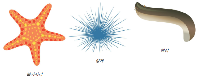 불가사리, 사미류(불가사리의 일종), 성게, 모래 성게, 해삼 등이 극피동물에 속한다. 이들은 민물에서는 찾아볼 수 없다. 내부에 작은 뼈가 있고 5면체로 되어 있다. 문화권에 따라 성게와 해삼은 식용으로도 쓰이고 있다.