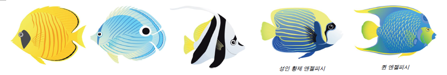 볼 수 있으며 회색 점이 박혀있어 구분이 된다. 열대 바다에서는 황제 엔젤피쉬가 자주 눈에 띄는 데 노란색과 파란색의 스트라이프 무늬가 있다. 큰 엔젤피쉬는 겁이 없으며 자주 다이버에게 접근한다.