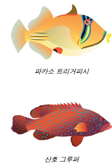 또 다른 오색찬란한 산호초 어류에는 솔져피쉬 (Soldier Fish), 스쿼럴(Squirrel), 서전피쉬(Surgeon Fish)와 트리거피쉬(Triggerfish) 등이 있다. 또 다른 산호초 서식 어류로는 그루퍼(Grouper)와 스내퍼(Snapper)의 큰 무리가 있다. 어떤 종들은 커다란 크기(3m)까지 자라지만, 화려한 색채의 패리 바슬렛