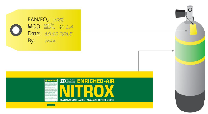 공기 이외의 기체를 담는 모든 스쿠버 실린더는 해당 라벨이 부착되어야 한다. 나이트록스가 담겨 있으면서 마킹이 되어 있지 않은 경우 그것을 공기라고 생각하고 생각지도 못한 CNS 산소 중독에 걸릴 수 있다. 마찬가지로 공기가 들어있는데 나이트록스 마킹을 보고 나이트록스로 잘못 알고 다이빙하면 감압병의 위험성이 증가한다.