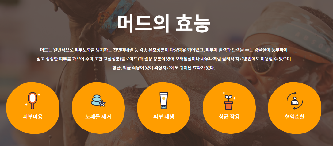 머드는 여러가지 종류가 있지만 그중에서도 ‘이스라엘 사해산’, ‘캐나다 콜롬비아 해안의 빙하토’,‘러시아 바이칼’, ‘캘리포니아 클레어머드’, ‘뉴질랜드 화산머드’가 많이 알려져 있으며 그동안 우리나라에서는 전량 수입에 의존하고 있었다.
