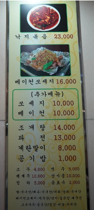 낚지볶음1개 + 베이컨쏘세지 1개(여성 2~3인기준) 먹다가 쏘세지나 베이컨 추가하시면 되며, 기호에 따라 계란말이 정도 시키심을 추천합니다.